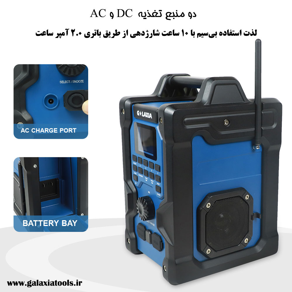 اسپیکر شارژی گلکسیا با ولتاژ دوگانه (AC: 220-240 ولت و DC: 20 ولت) طراحی شده است که انعطافپذیری بالایی برای استفاده در شرایط مختلف فراهم میکند. این دستگاه دارای توان خروجی 16 وات است که صدایی قدرتمند و شفاف تولید میکند. فرکانس کاری آن 50/60 هرتز است و از رادیو DAB با باند 174-240 مگاهرتز و رادیو FM با باند 87.5-108 مگاهرتز پشتیبانی میکند.