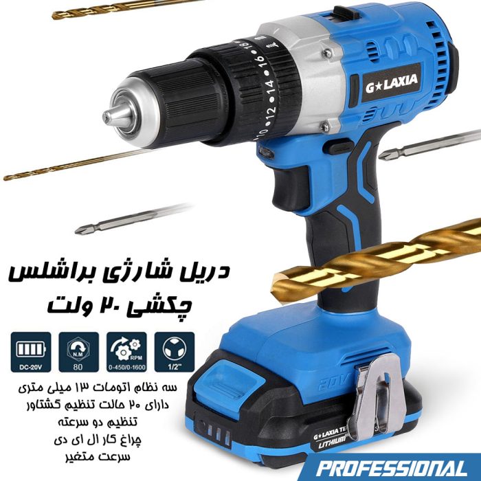 معرفی دریل شارژی براشلس چکشی 20 ولت گلکسیا مدل 95703