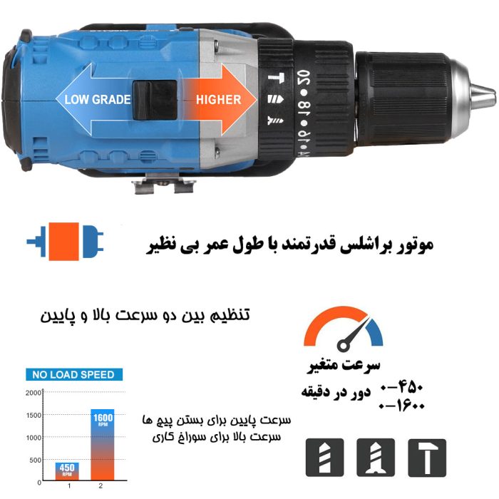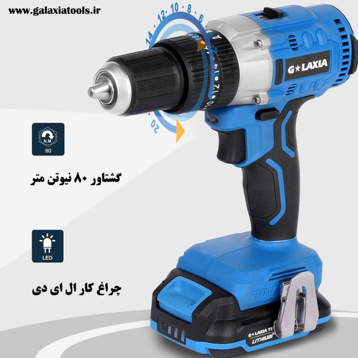 دریل گلکسیا مدل 95703 با ولتاژ 20 ولت کار میکند و دو سرعت مختلف ارائه میدهد: