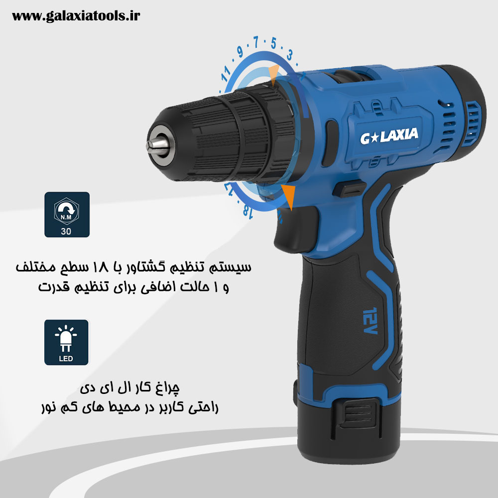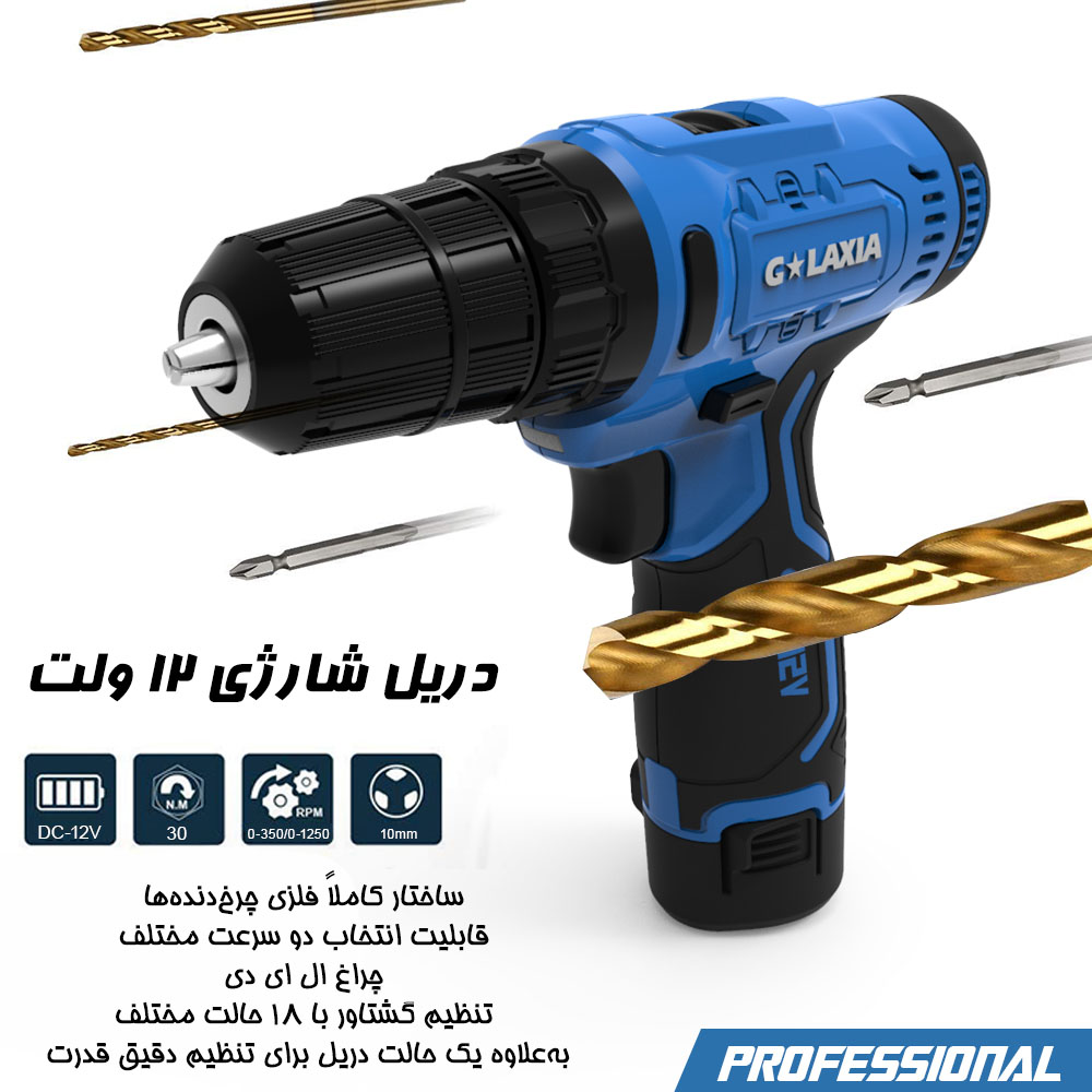 شرکت گلکسیا این دریل شارژی را با ولتاژ 12 ولت تولید کرده است. دستگاه با دو سرعت بیباری 0-350 و 0-1250 دور در دقیقه، نیازهای مختلف کاربران را پوشش میدهد. سهنظام 10 میلیمتری آن امکان استفاده از متههای متنوع را فراهم میکند و حداکثر گشتاور 30 نیوتنمتر به شما اجازه میدهد تا روی چوب، فلز و پلاستیک کار کنید.